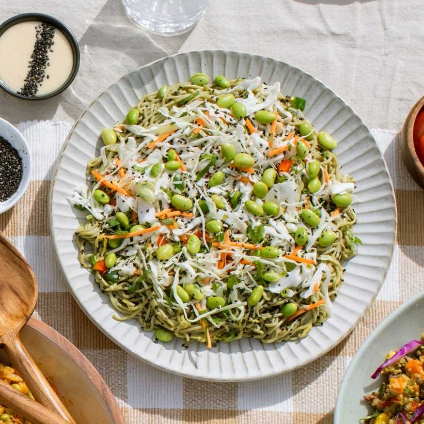 Soba Noodles And Pickles (Soba Noodles (45%) (Wheat Flour, Water, Buckwheat Flour, Cassava Starch, Wheat Protein, Green Tea Powder, Egg White Powder, Salt), White Radish, Vinegar, Canola Oil, Tamari Soy Sauce, Rice Vinegar, Sugar, Miso Paste (Soy), Sesame Oil, Ginger, Salt, Turmeric, Lemon Juice Concentrate, Thickener (Xanthan Gum), Black Pepper), Slaw (Cabbage, Carrot, Capsicum, Coriander, Shallots), Edamame (Soy), Orange, Ginger & Miso Dressing (Dressing (Canola Oil, Rice Vinegar, Orange Juice (Contains Preservative (202), Antioxidant (300)), Miso Paste (Soy), Sugar Liquid, Maple Syrup, Tahini Paste (Sesame), Ginger, Garlic, Thickener (Xanthan Gum))), Roasted Black Sesame Seed.